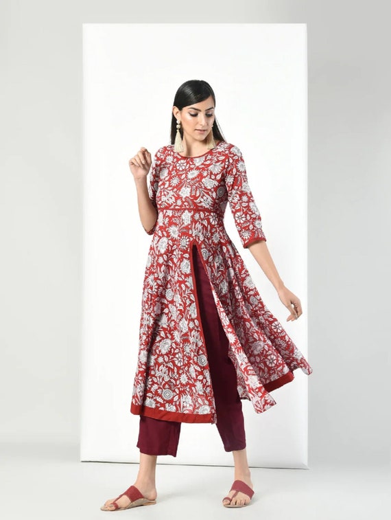 Indian Ethnic Hand Block Floral Printed Flared Kurta Kurti Designer Pakistani Bollywood Designer Dress Sleeve 3 4 Indo Western Gift For Her